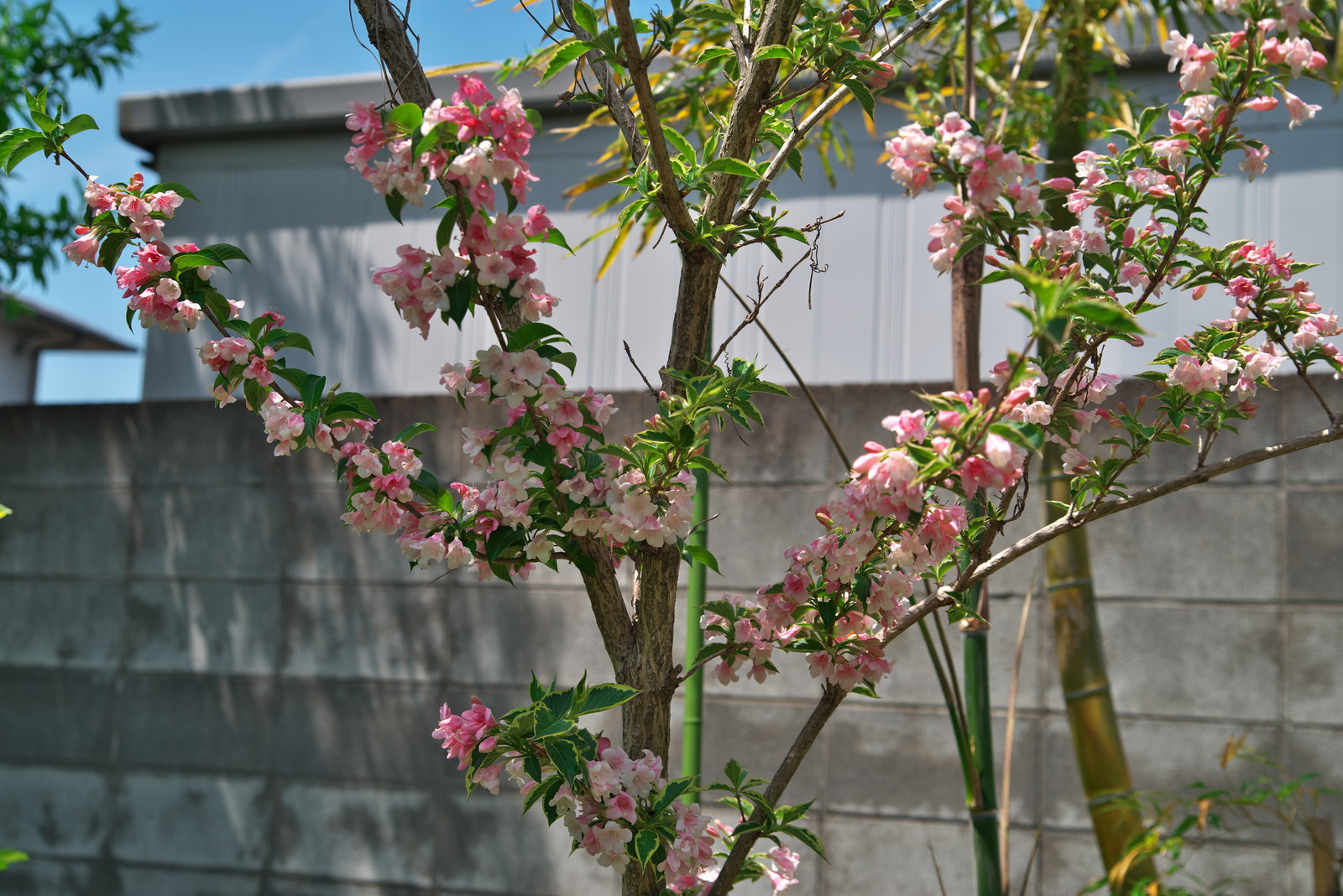 画は、畑に咲くハコネウツギ。