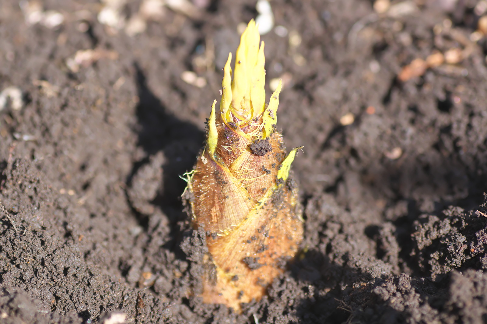 よって、朝8時から最後のナシの人工授粉を1時間程度行い、畑パトロールをしていると、な、なんとなんと、タケノコが4カ所から顔を出しているではないか!!
