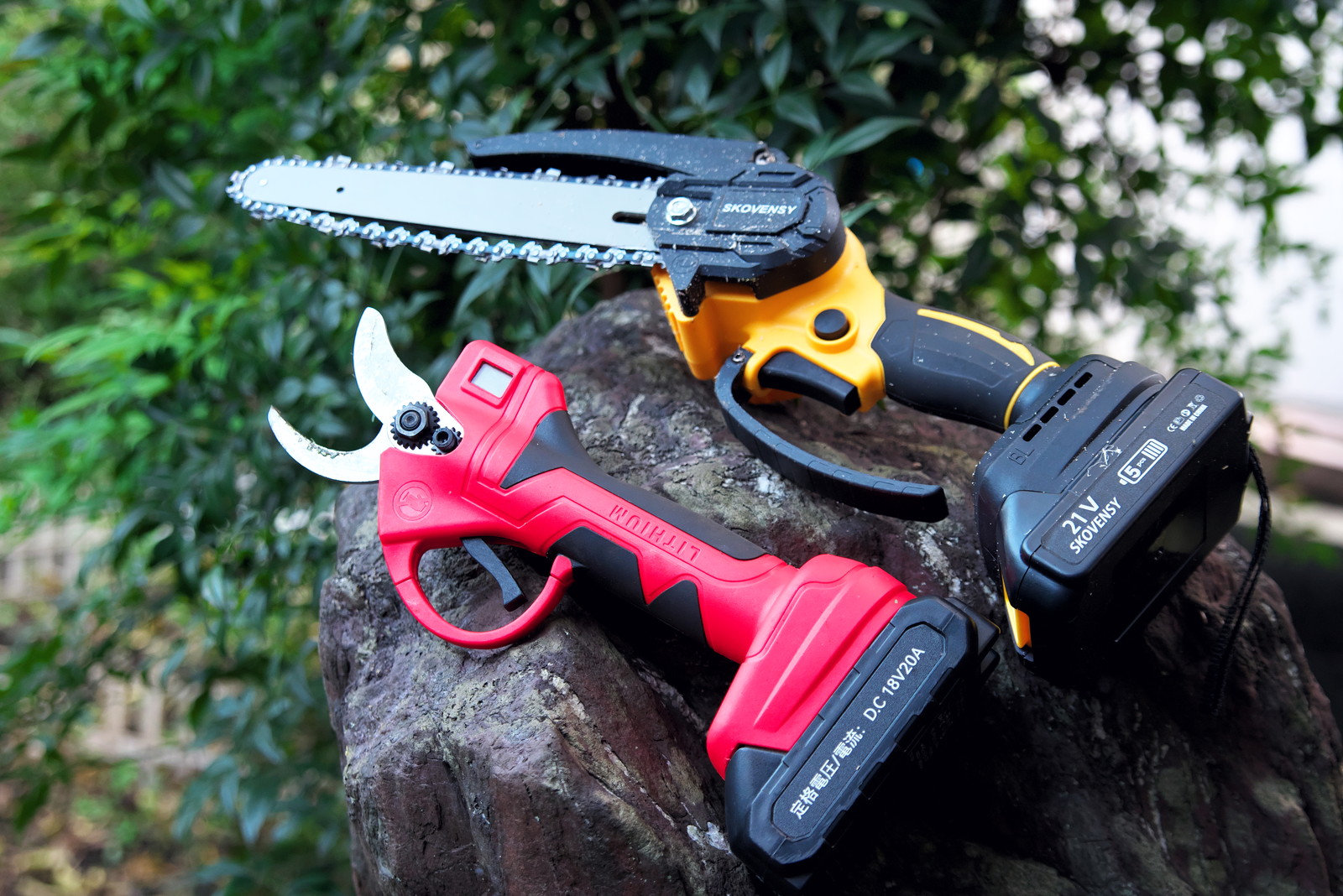 画は、二つの相棒。(小型チェーンソーと電動剪定バサミ)