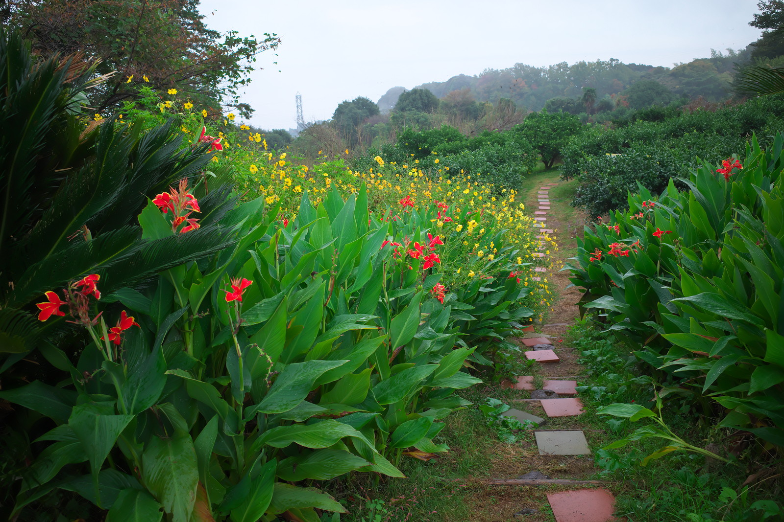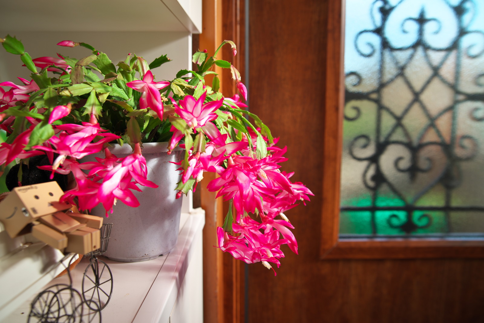 画は、室内で花をつけたシャコバサボテンとタマネギ70本程度を定植した畑の様子。