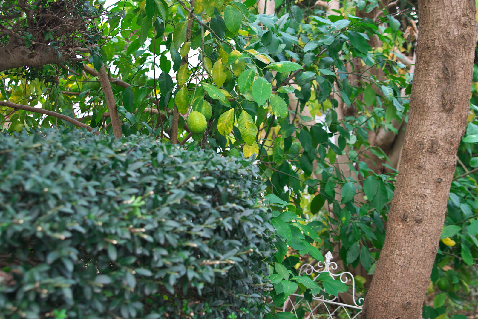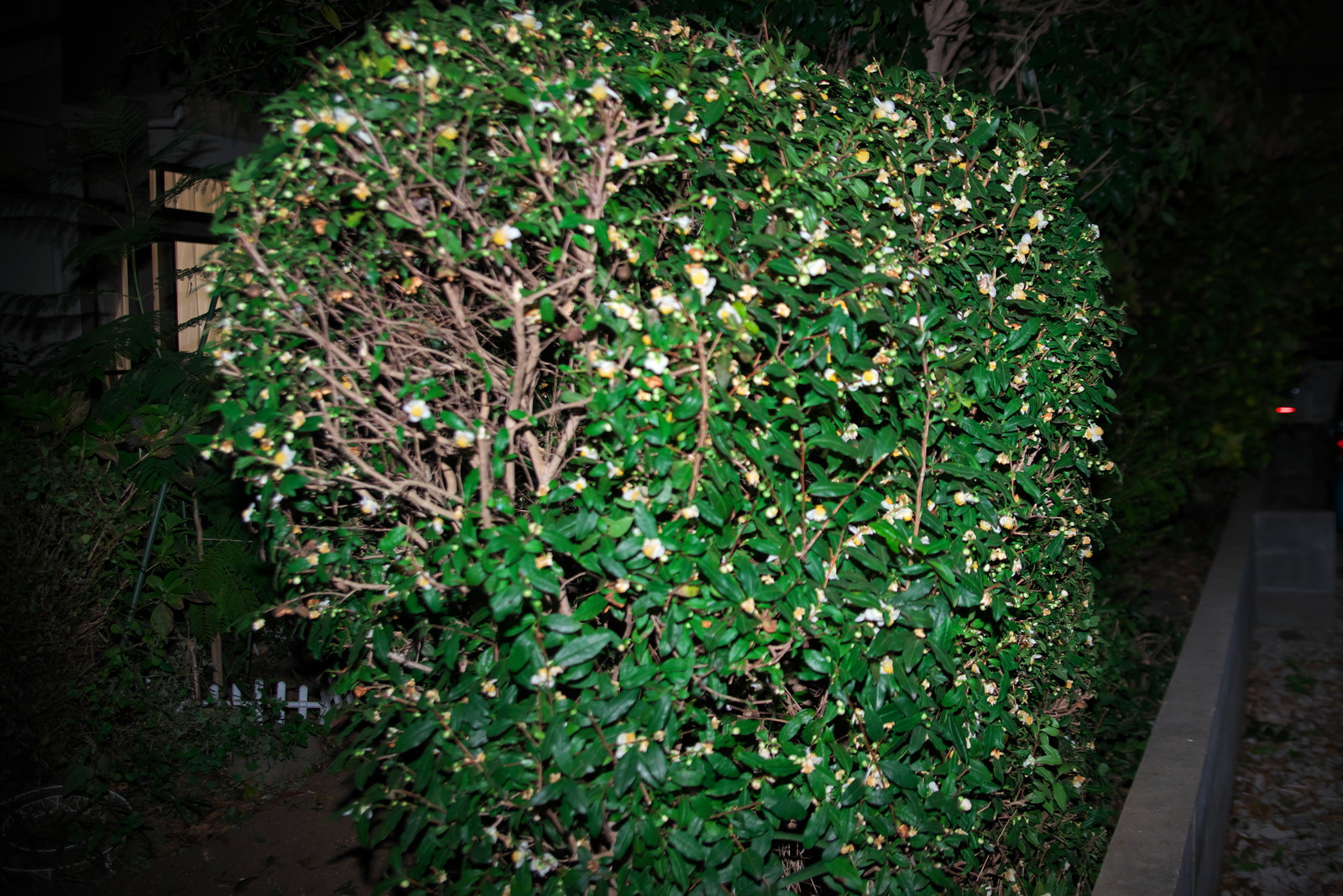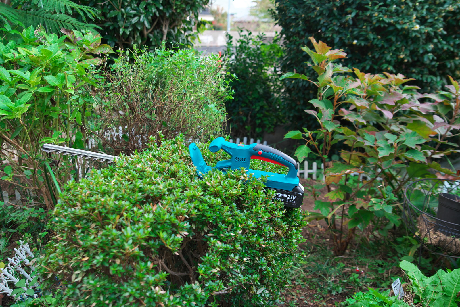 加えて、お隣さんとの境界線にある茶の木を電動ヘッジトリマーで筒状に刈り込んだ。境界線上の部分は平面に刈り込んだ。若干いびつだが、所詮シロート。正面から見れば筒型になっているのでよしとする。