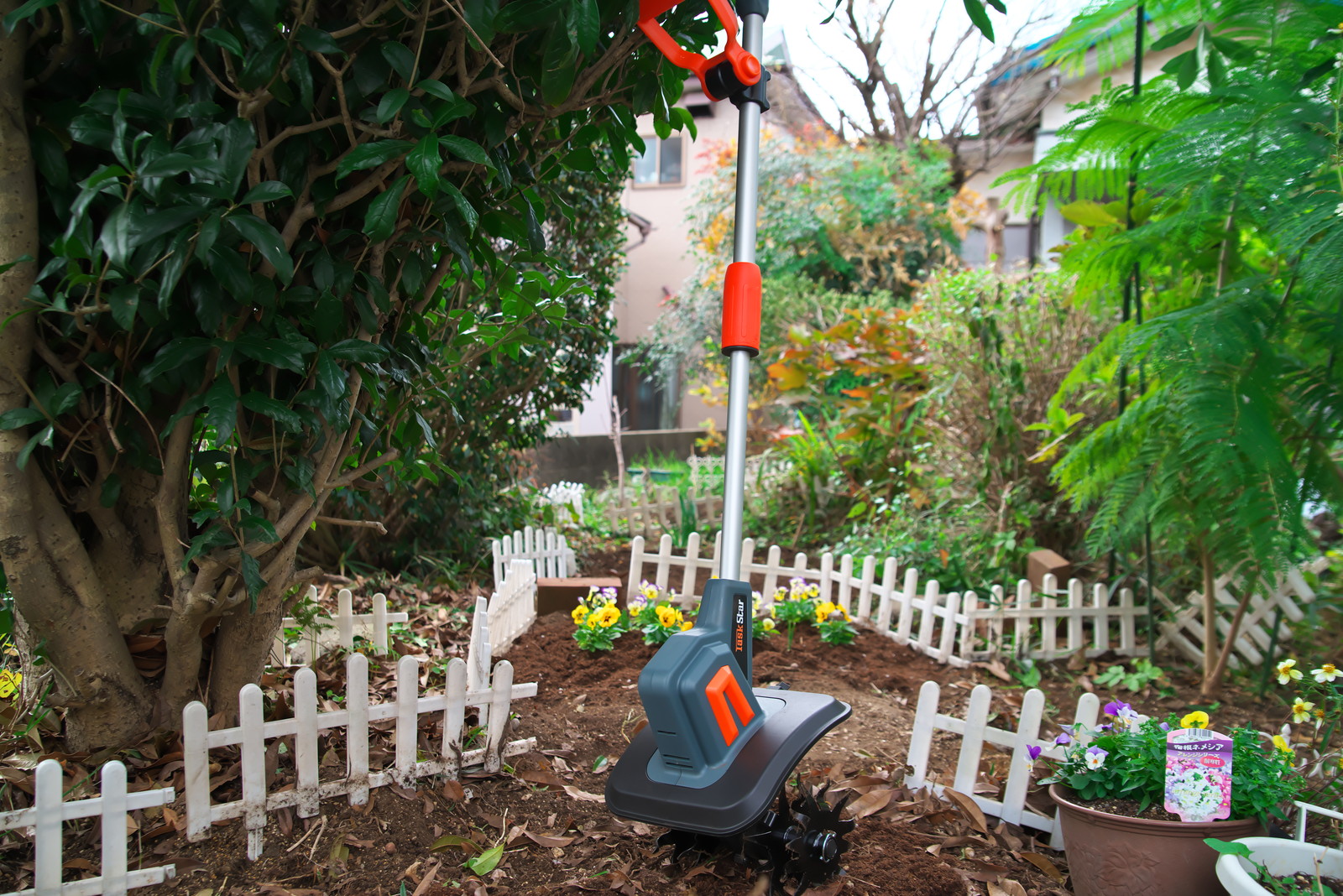 画は、着手した花壇作りと電動カルチベーター(耕うん機)。