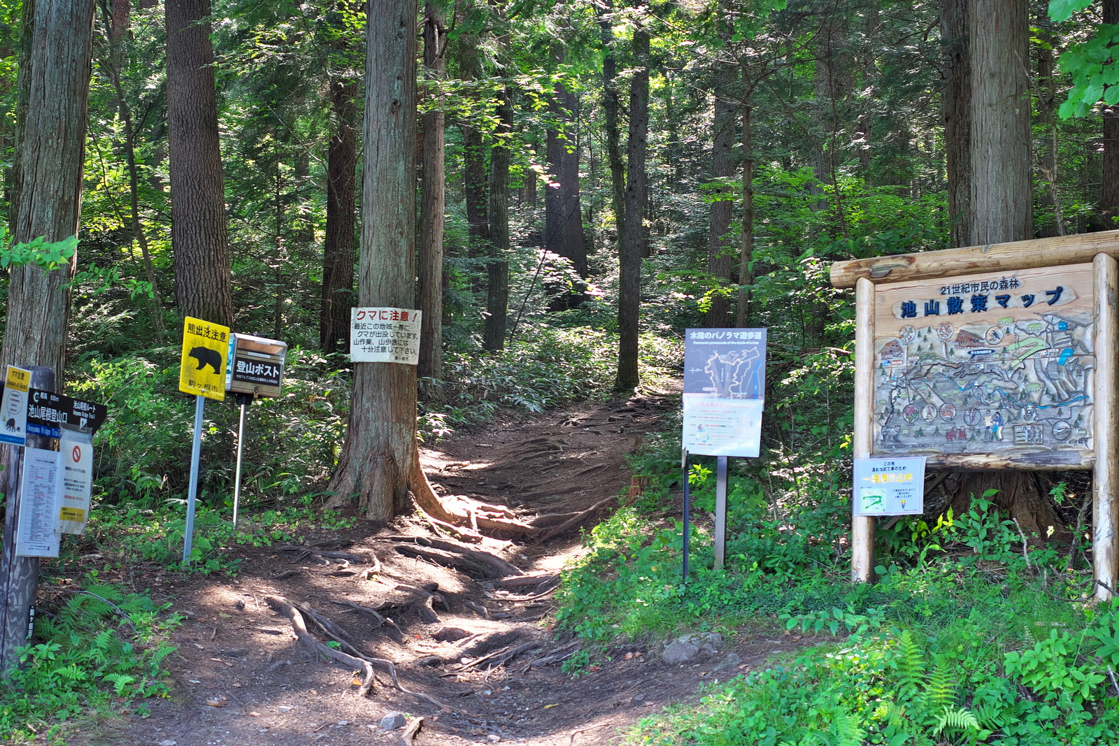 今回、剣ヶ池にいったん下り、その先の登山道入り口から山歩き開始です。(登山は最低限の装備は必須です。)