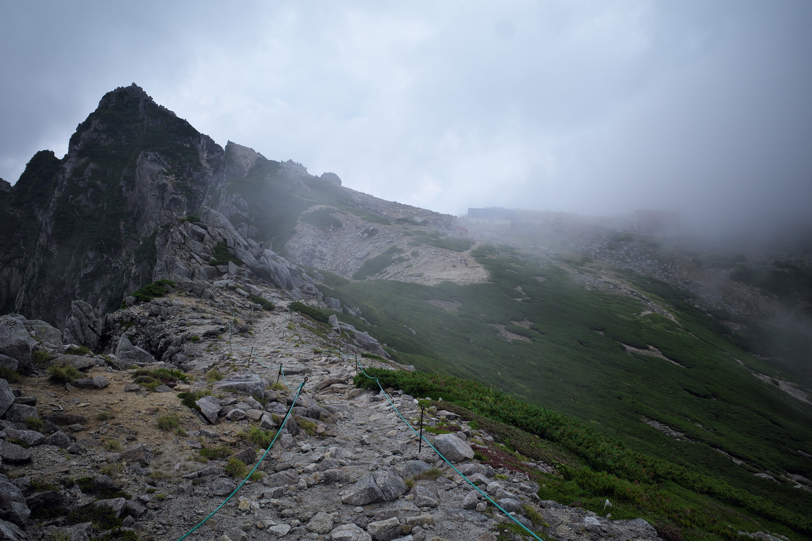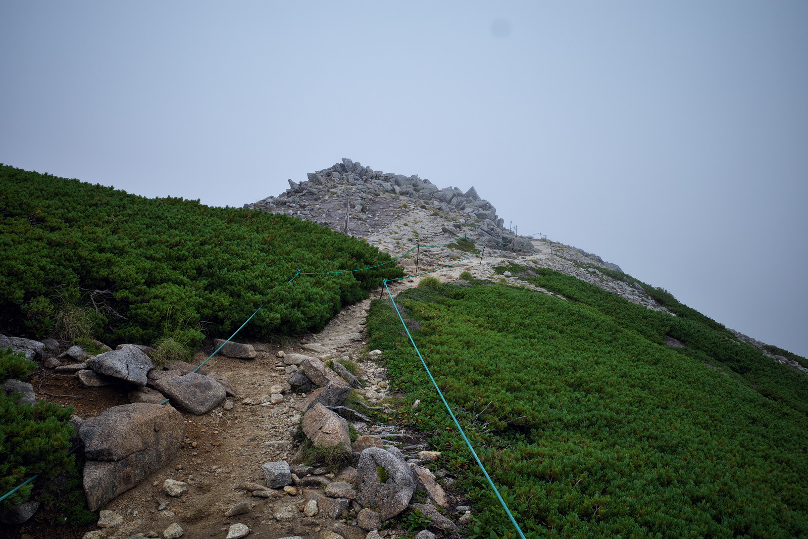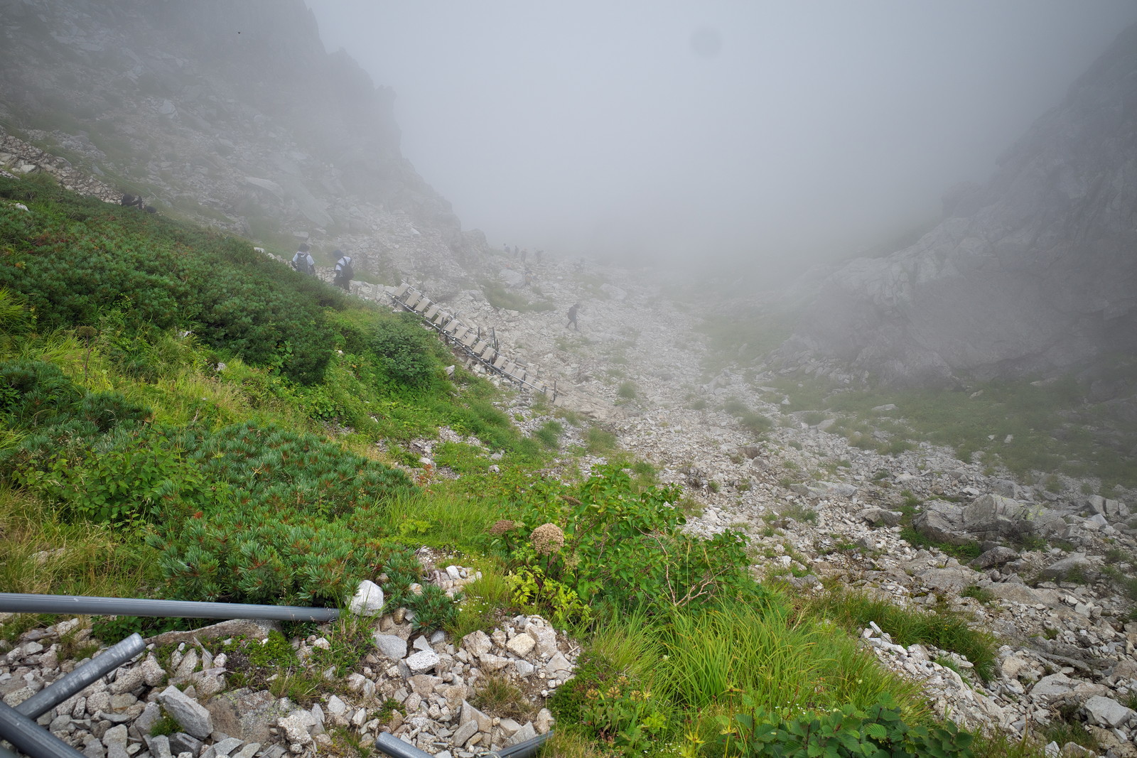 再び、乗越浄土に戻り、中岳方面へ。山の天気は変わりやすく、雨が降ってきたと思ったら、ガスって前が見えず。