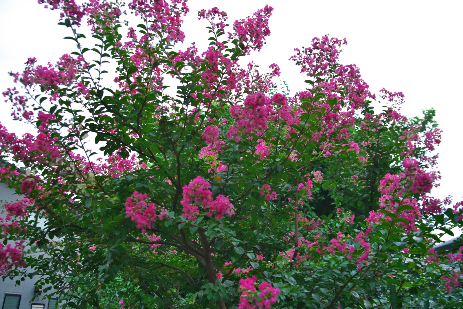 すると、サルスベリの木にピンク色の花が満開になっていた。暗くなる中の撮影なので画像精度は低い。