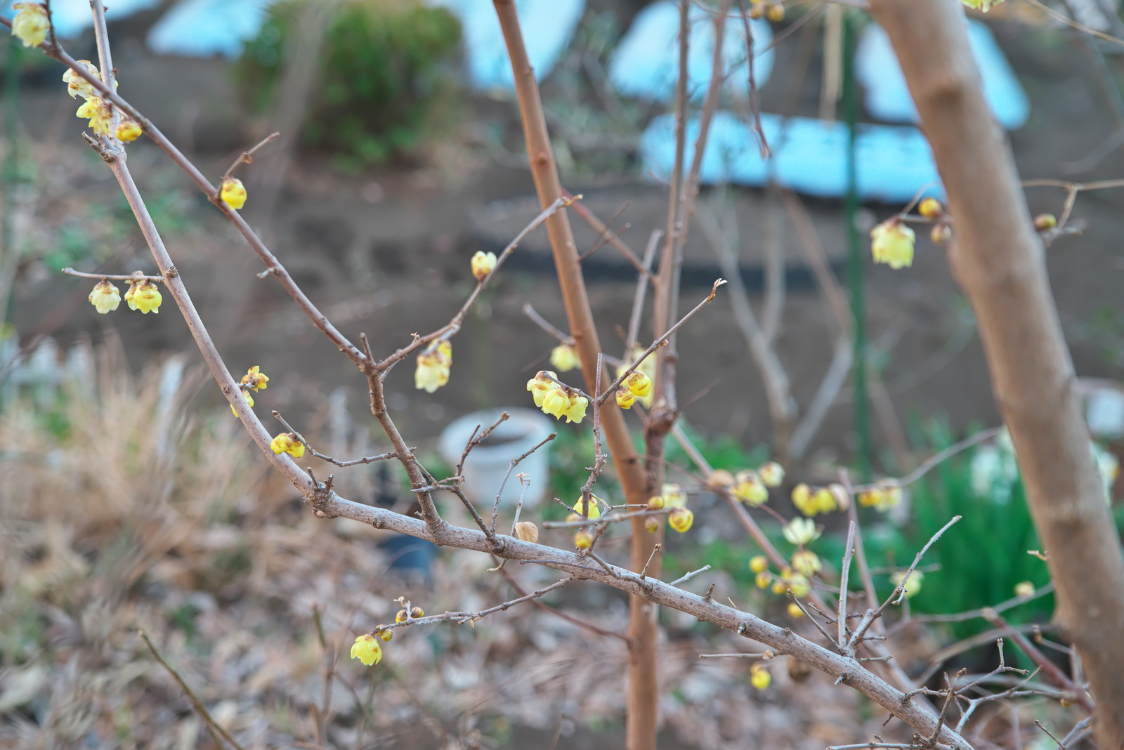畑には花梅(野梅性)が可憐に咲いている。横にはロウバイ。