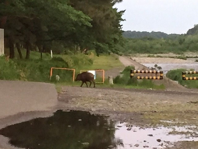 夕方、ワンコといつもの川原に散歩に出かけたところ、な、、、なんと、イノシシにばったり!