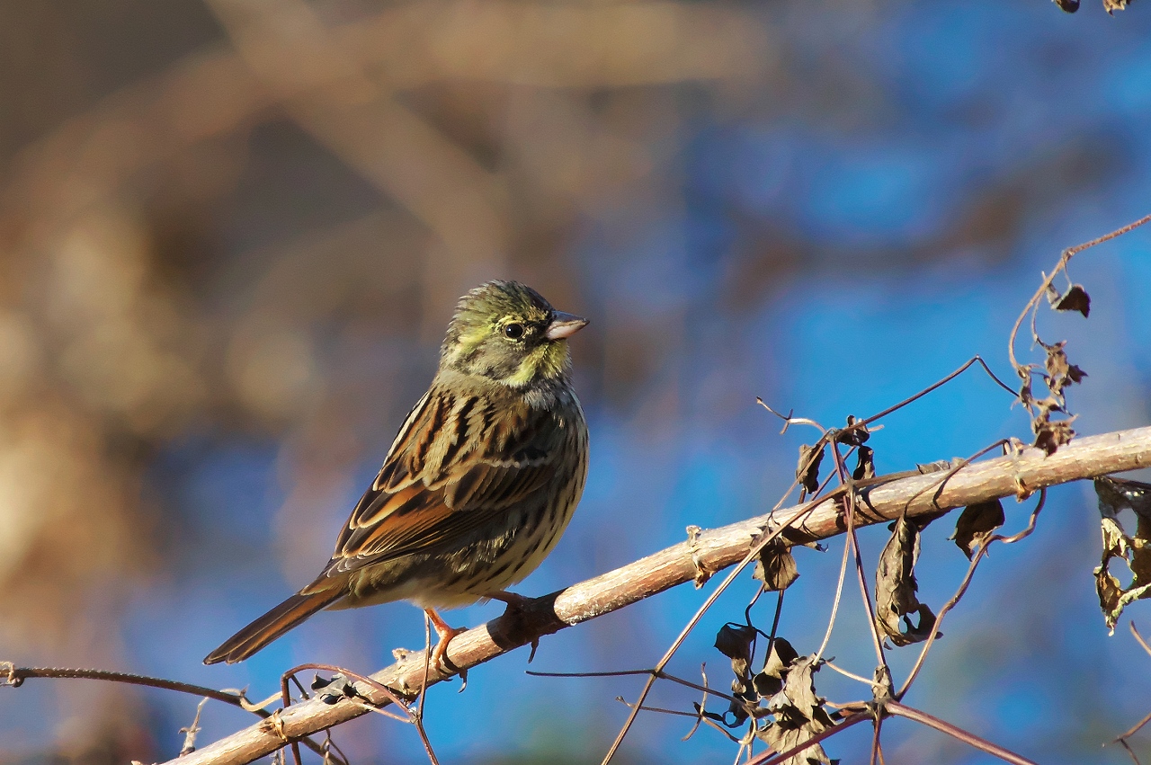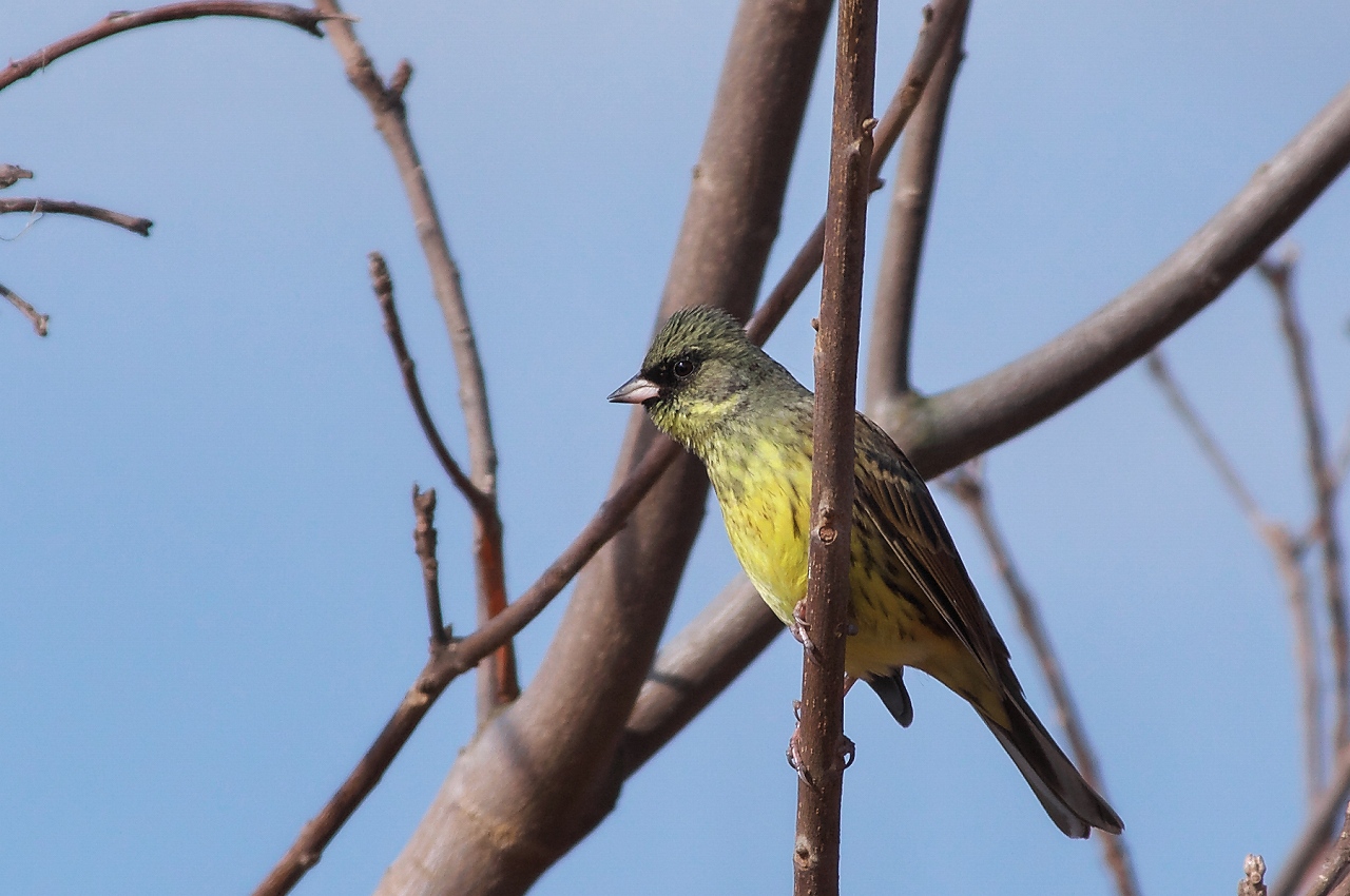結果、「ジョウビタキ」と「アオジ」を撮ることができました。目視の段階では「マヒワ」かなって思いましたが、お腹全体が黄色いことや足が赤みを帯びていることから「アオジ」のオスと判明しました。