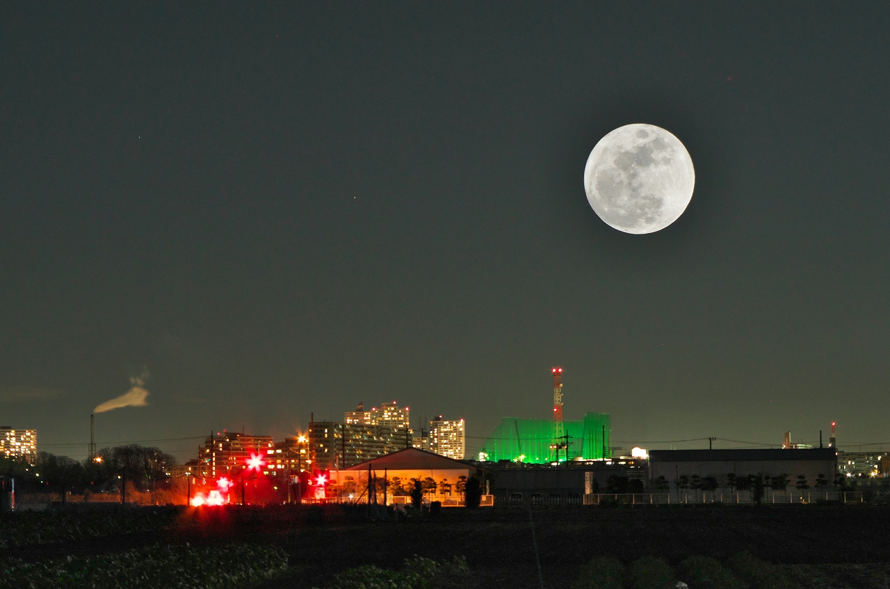 月の大きさと夜景のバランスがファンタジーな画となりました。