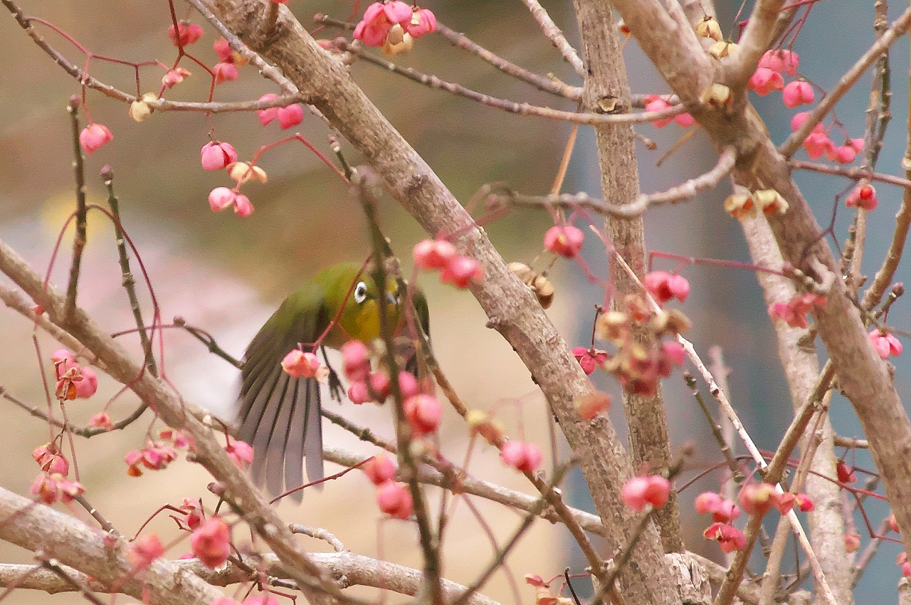 カワセミは、枝が邪魔して構図的には、×、コゲラとメジロは花がバックなのでノイズは感じられなく写せました。コガラが飛び去った後、入れ替わりにメジロが現れました。また、運よく飛んできた瞬間もカメラに収められました。