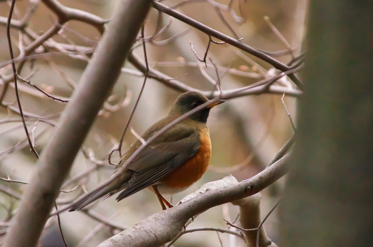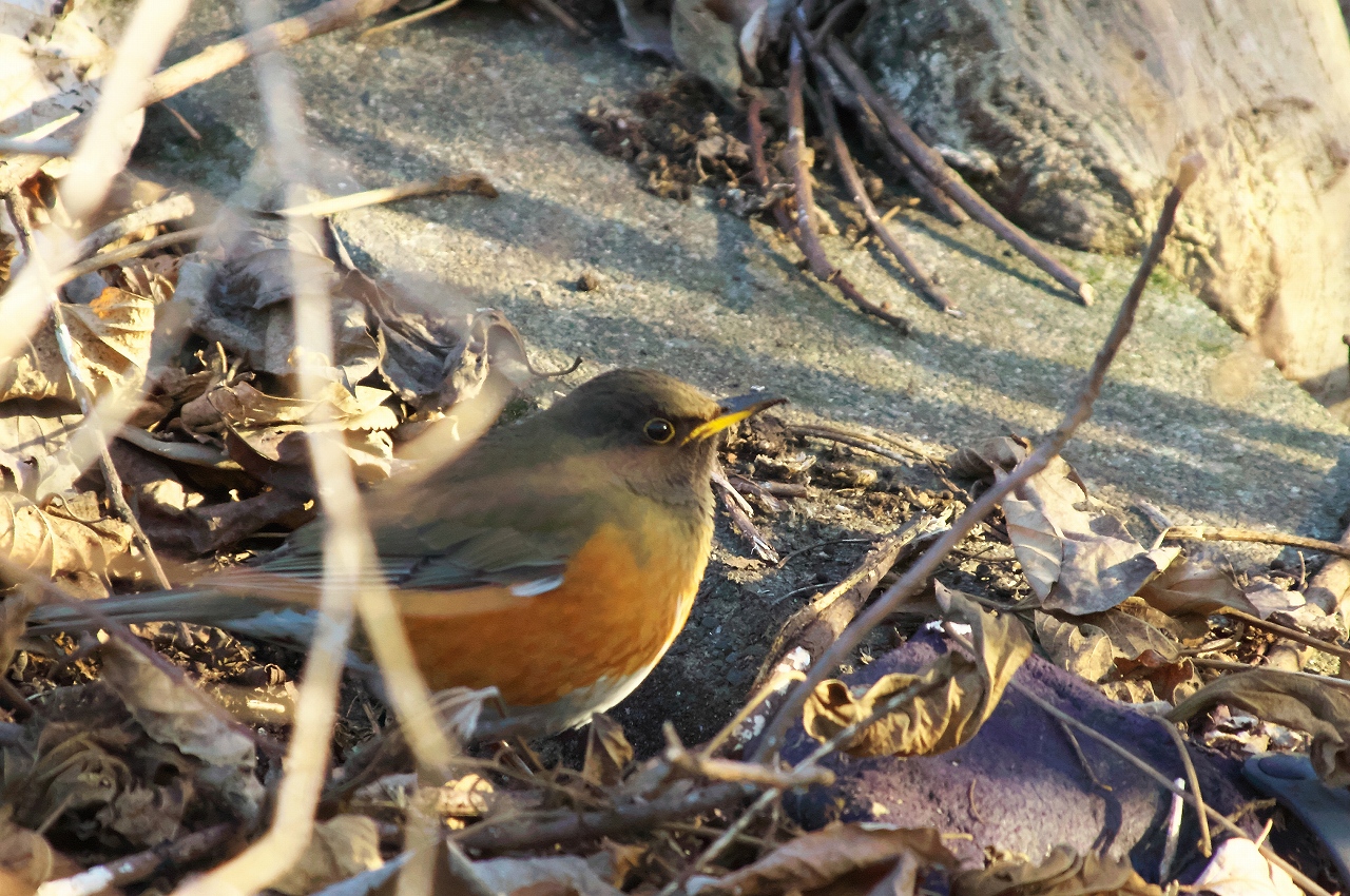 雨上がりの濡れた枯れ葉の下を採餌していたのは「シロハラ」でした。別の場所では「アカハラ」が木々の中で休んでいました。暗い場所だったことから、ノイズが目立ちますが証拠写真です。