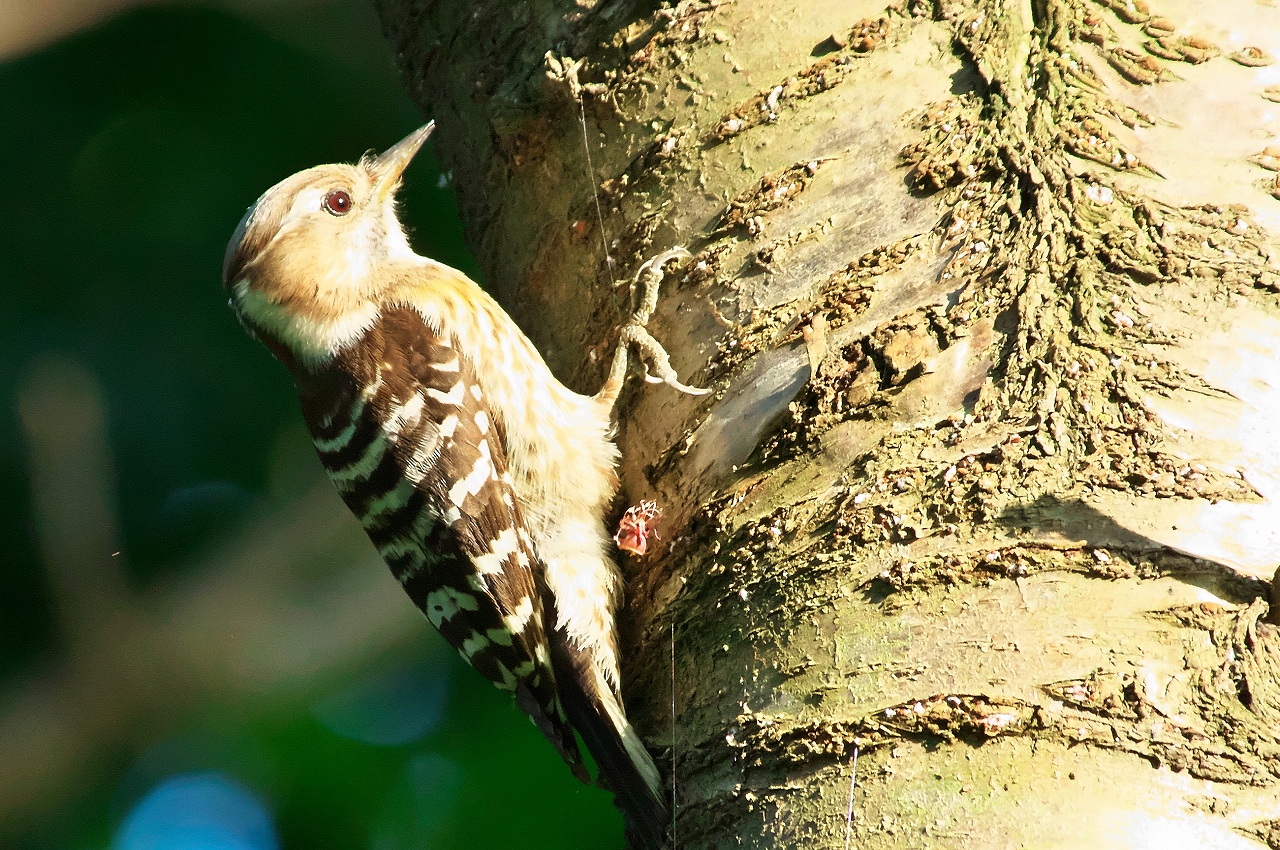 実は、コゲラの雄には後頭に赤い羽根があるのです。それも、普段は他の羽に隠れて見えず、風の強い時に確認することができるのです。