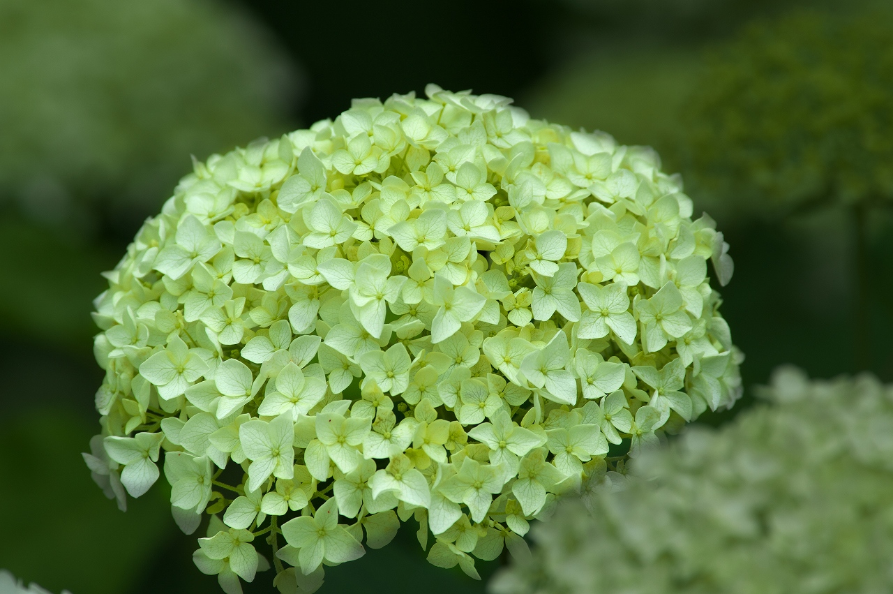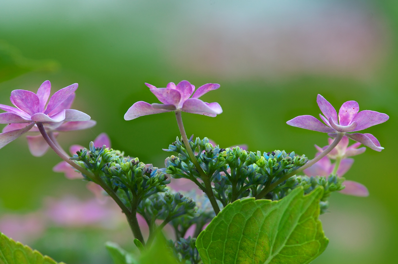 自宅庭にも、アジサイが咲いているので明るいレンズ(単焦点レンズ)で撮影してみました。以前からトライしてみたかった構図です。