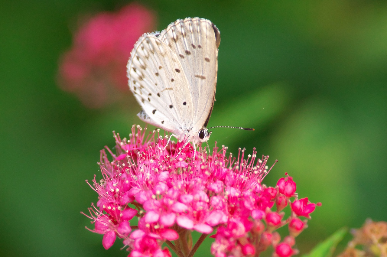 画像は、昨日撮ったシモツケの蜜を吸うシジミチョウ(ヤマトシジミ)です。