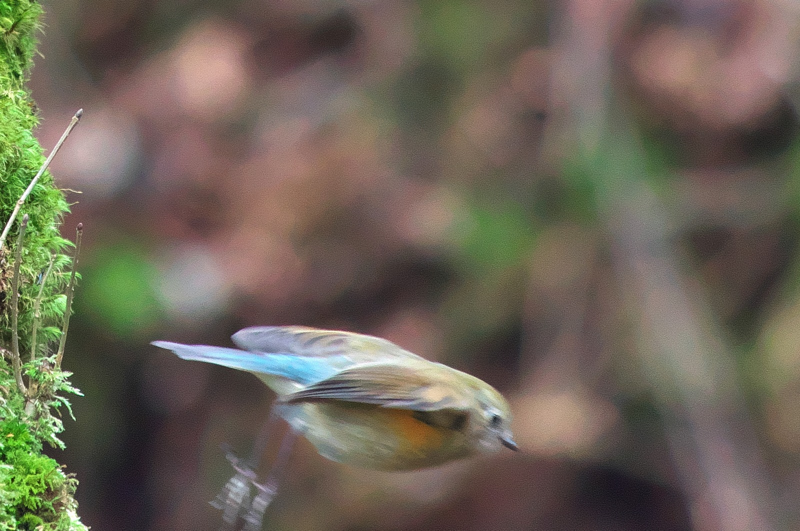 さて、今日の画は金時山で会えたルリビタキ(♀)が飛び出した瞬間をパチリしたもの。