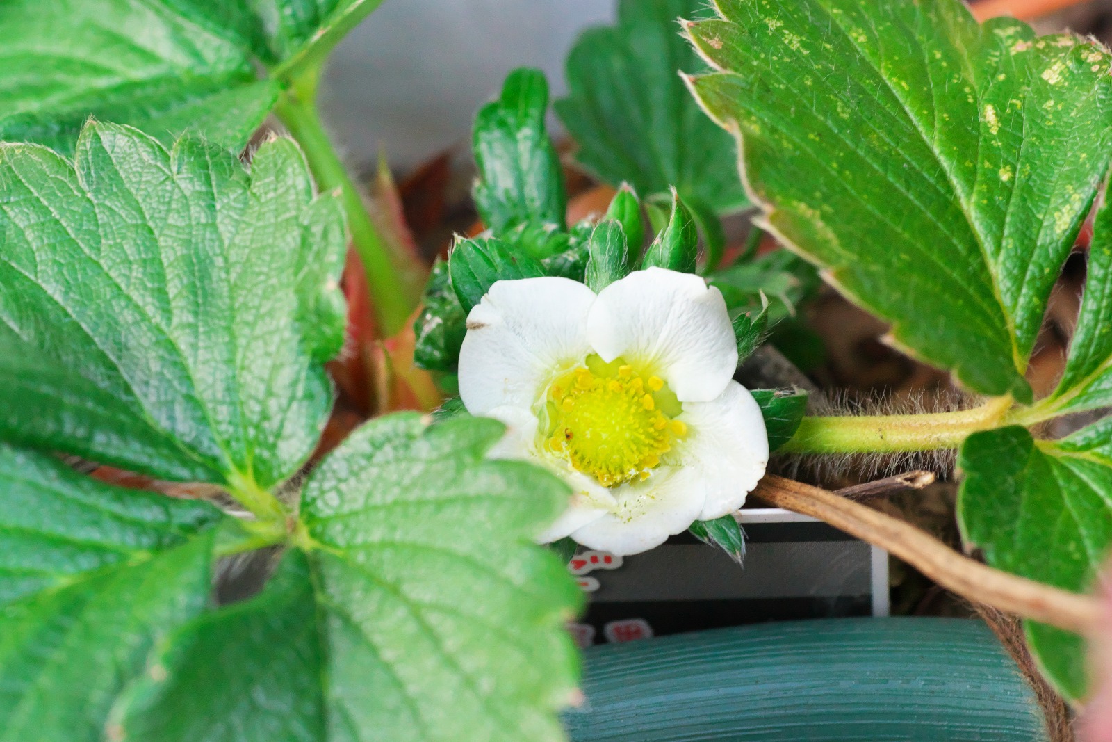一方、冬なのにイチゴの花が咲いた。暖冬なのかな。