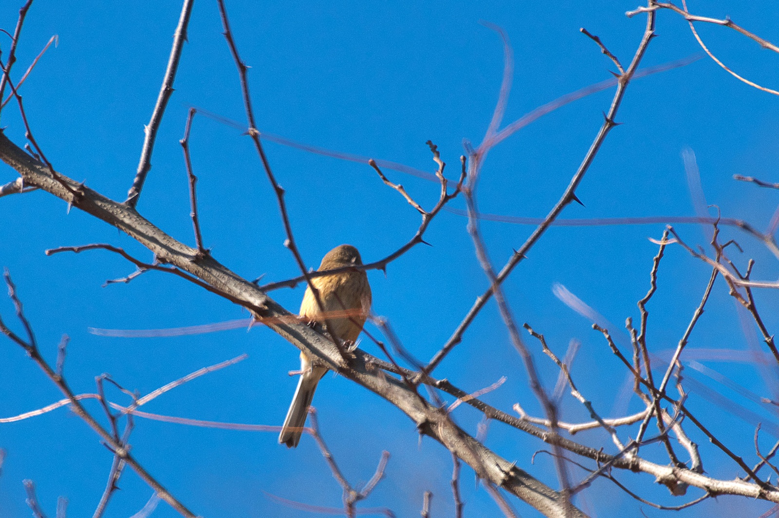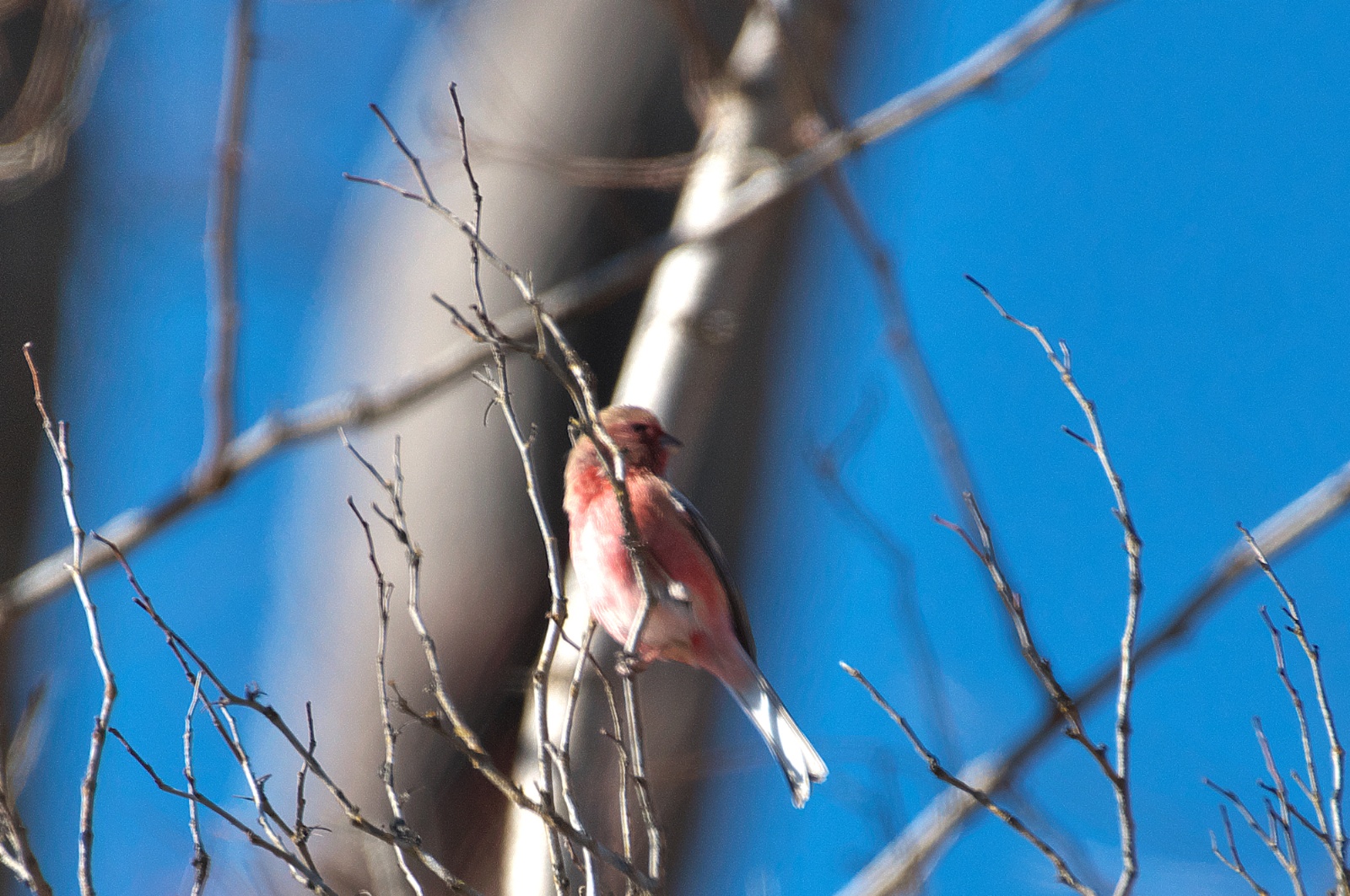 なんとなんと、ベニマシコが現れた。かなり遠くでの撮影のため、証拠写真程度の写りだが、はっきりベニとわかる。それもつがいで…。