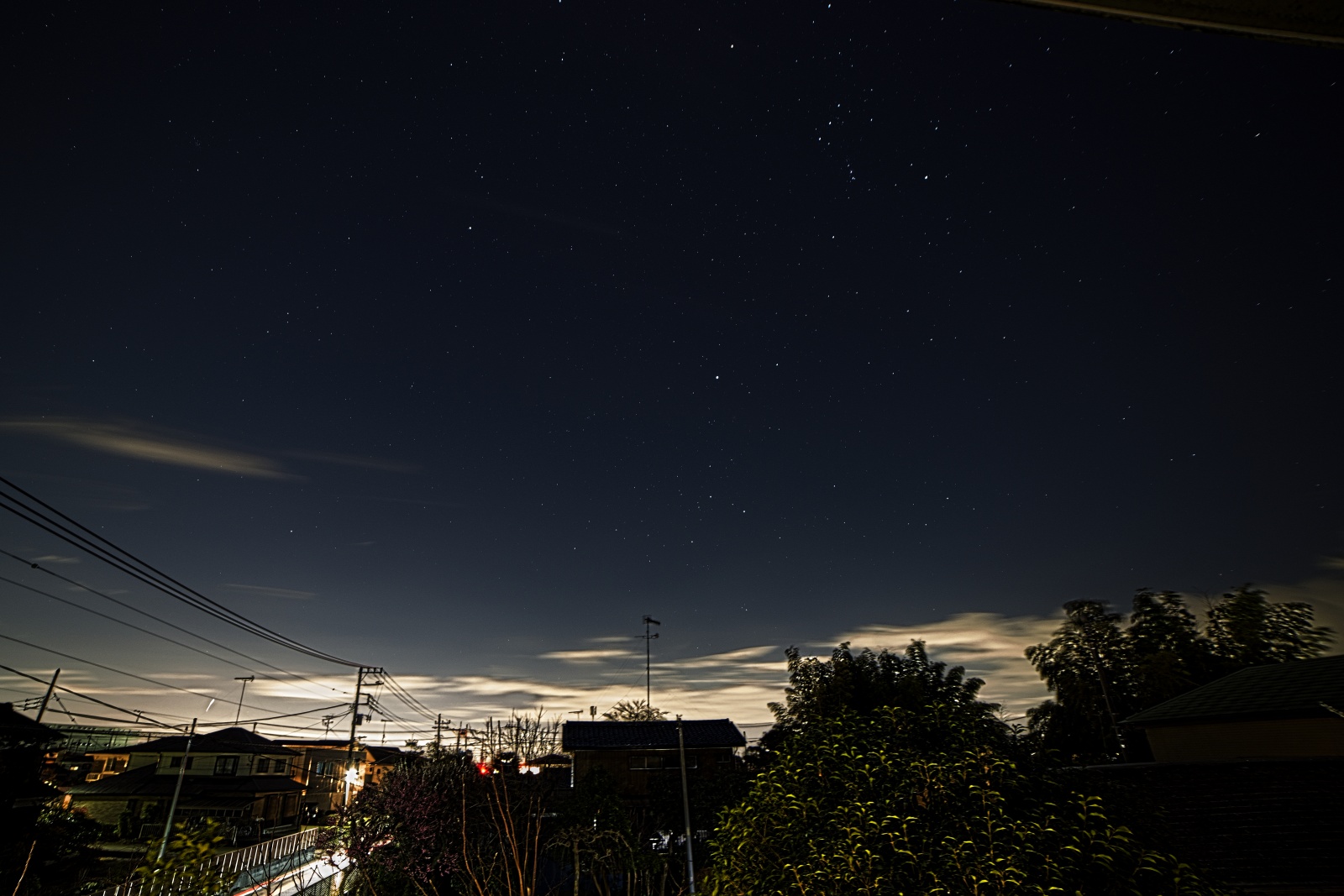 正直、超広角なので、光害を避ける意味でも、もっと上に向けて撮ればいいのですが、屋根のひさしでこれが限界でした。(右上に少し写り込んでいるのがわかると思います。)