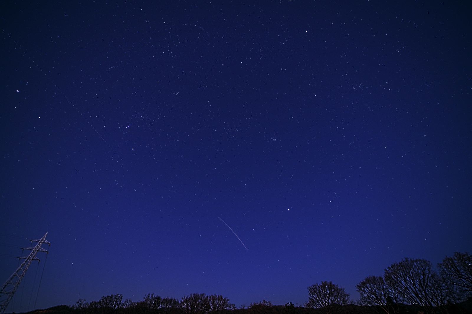 結果、満足の画になりました。。オリオン座がなんとかわかることと、オリオン座の左下の明るい星は、おおいぬ座のシリウスです。(中央に写っている星)