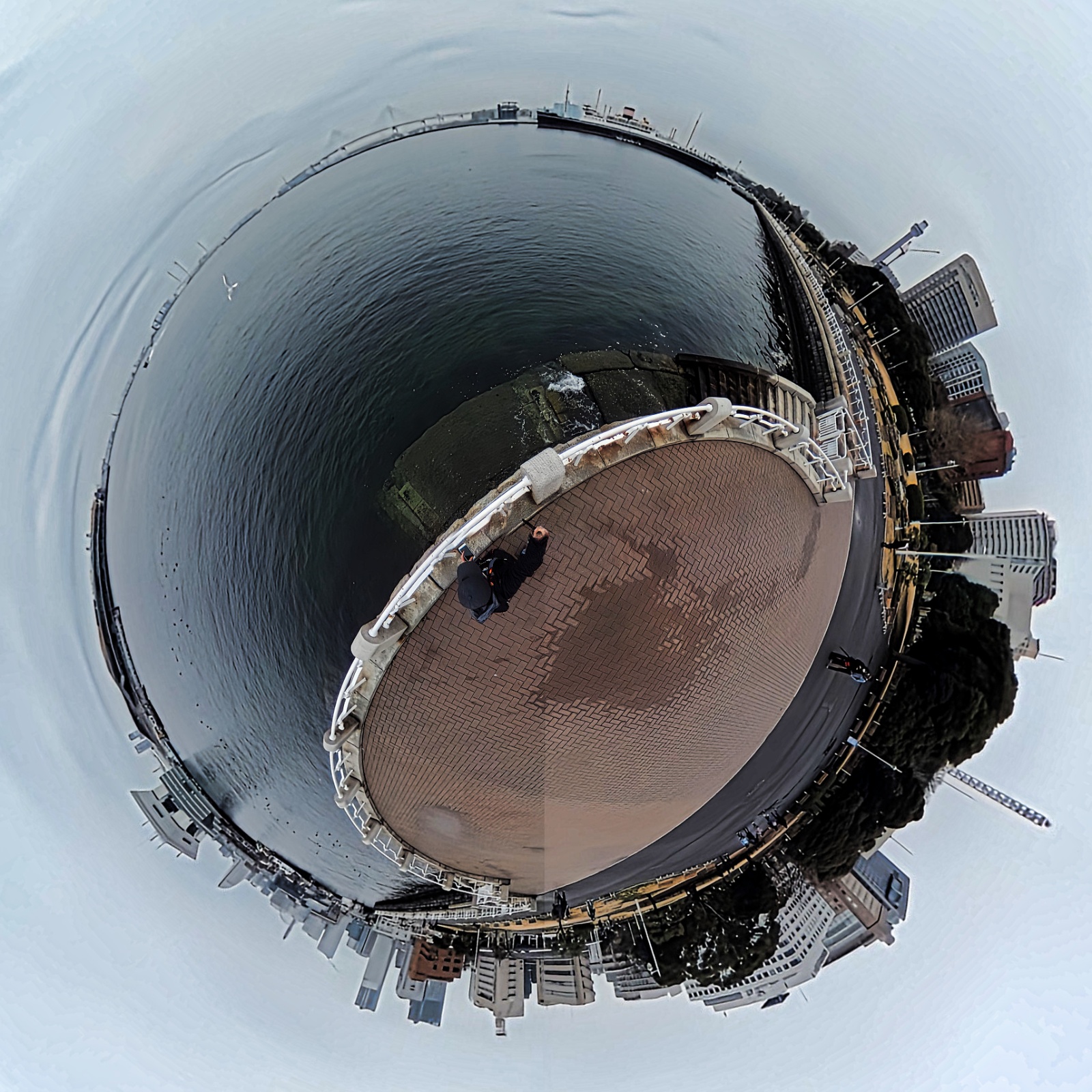 また、360度カメラ画像は、リトルプラネットという手法で、360度カメラ独特の画に仕上げてみた。こりゃなんとも面白い。