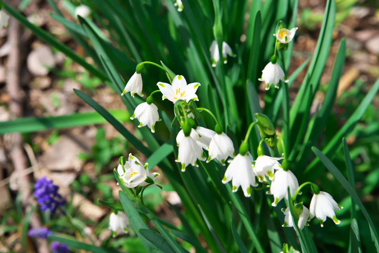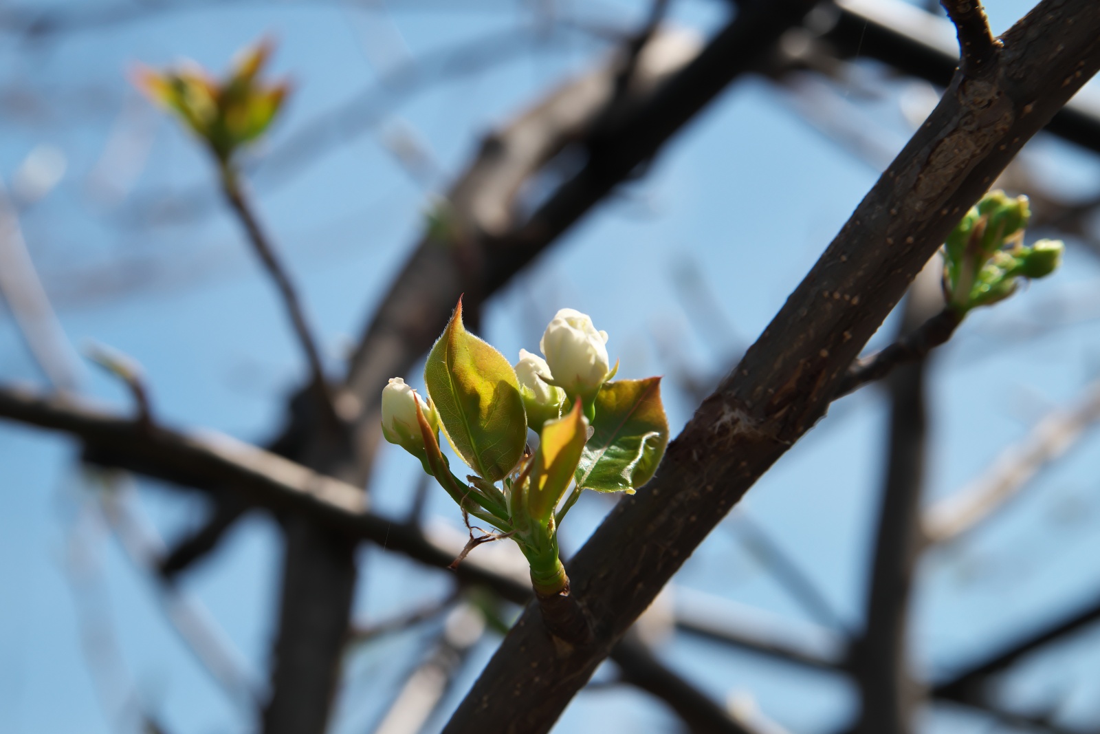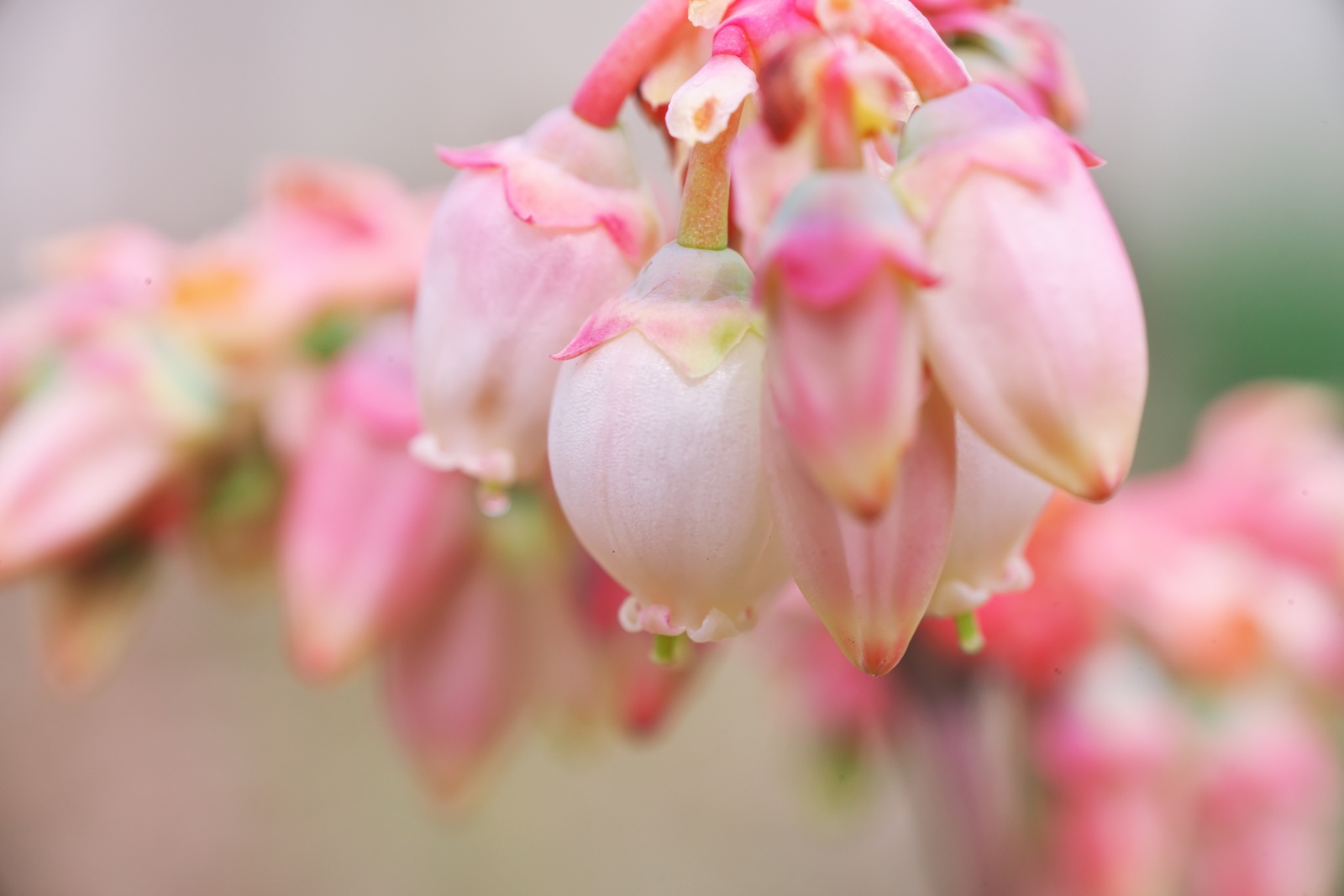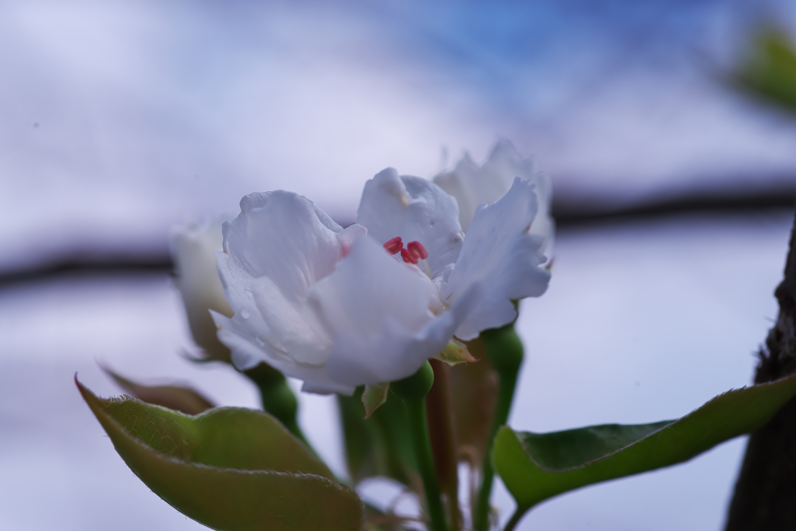 マクロで撮るブルーベーリーの花は、究極の写り、そして、洋梨の花も完全に開花しました。