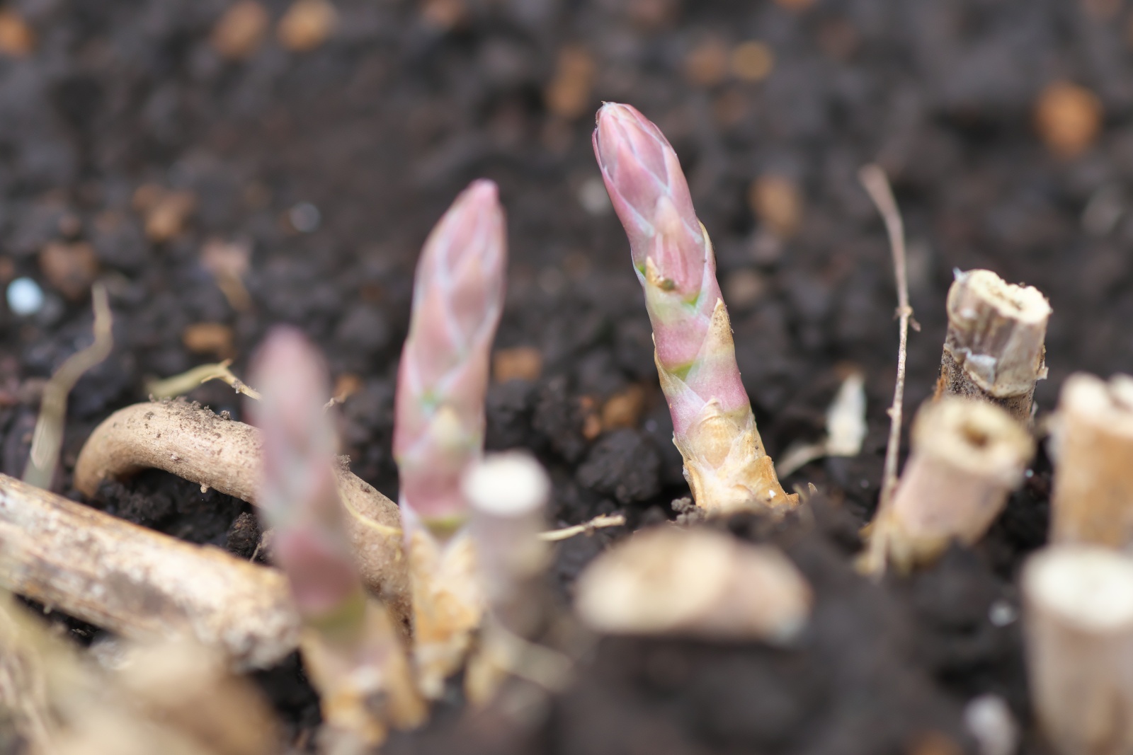 5年株のアスパラガスからはすでに、ニョキニョキのアスパラガスが出てきてはいたのですが、2年目の株からは快音無し。じゃなくて全く芽が出ていなかったため、枯れてしまったかと断念していたところ、ようやく、発芽の確認です。