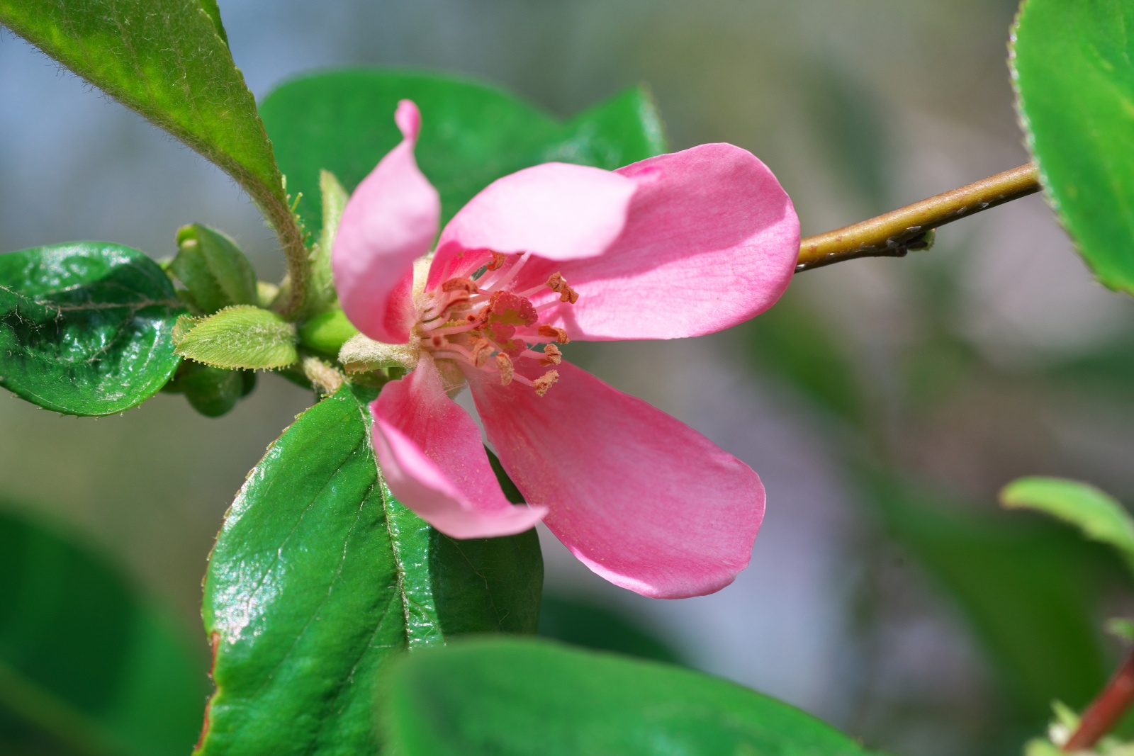 さて、庭のカリンが花を付けました。朝パチリしておきました。