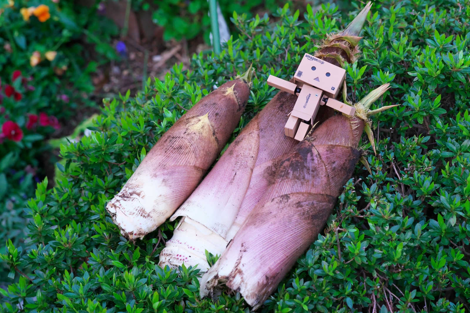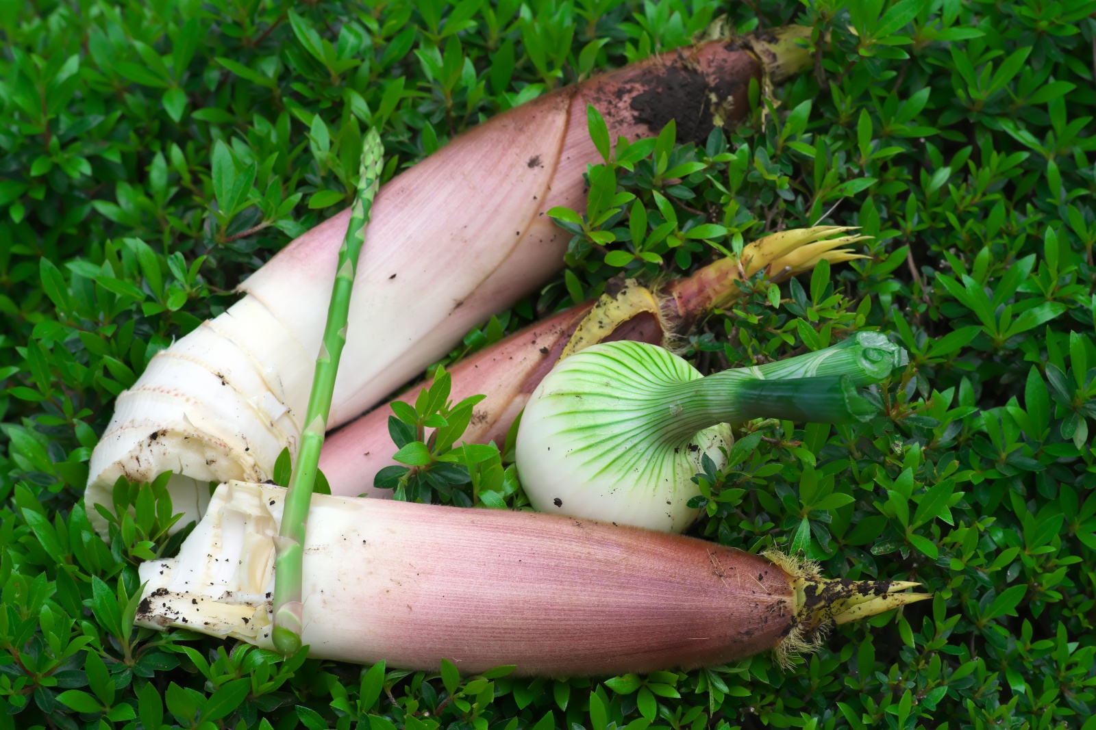 なんとまあ、今日もタケノコ3本収穫。そのほかにアスパラと早生のタマネギを収穫。