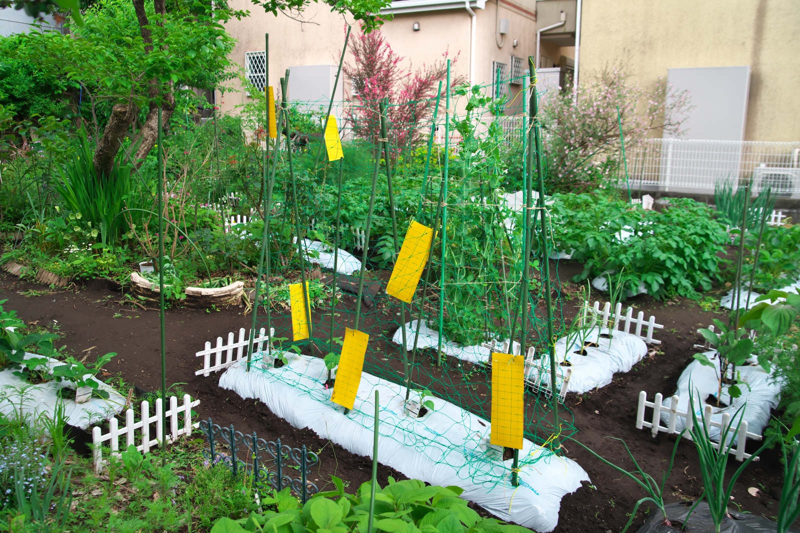 画は、ネットを張ったキュウリの定植場所とキュウリの前はサヤエンドウとニンニク。右は定植したナス3株。ワシャワシャしているのはジャガイモ。左にある樹は畑の中央にある柿の木。(小さな花がつき始めた)