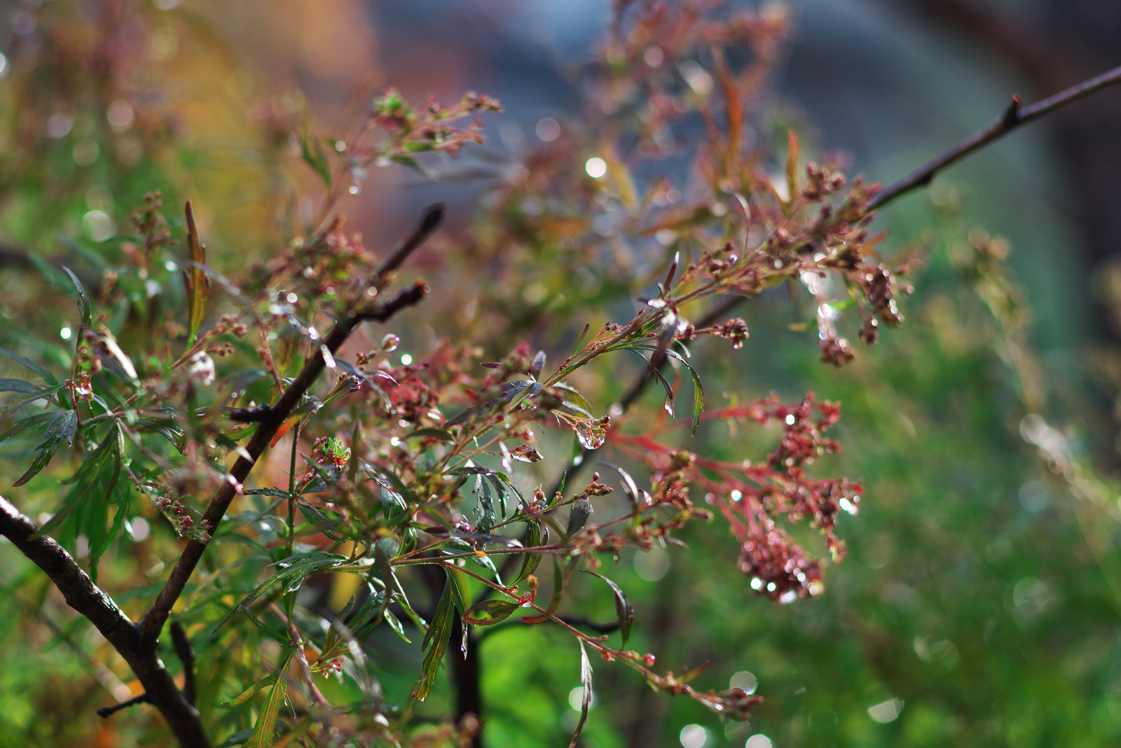 昨夜降っていた雨が上がり、薄日が差して植物について雨粒が綺麗だったのでパチリしてみた。